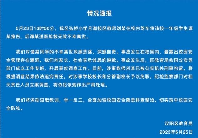 根據(jù)武漢市漢陽區(qū)教育局發(fā)布的情況通報(bào),我區(qū)弘橋小學(xué)月湖校區(qū)的一名教師劉某在5月23日13時(shí)50分發(fā)生了一起意外事件,導(dǎo)致該校一名一年級(jí)學(xué)生譚某不幸身亡。