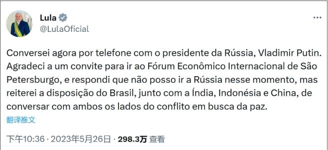 盧拉在推特上寫道:“我剛剛與俄羅斯總統弗拉基米爾·普京通了電話。我感謝他邀請我參加圣彼得堡國際經濟論壇,并回答說我目前不能去俄羅斯。但我重申,巴西愿意與印度、印度尼西亞和中國一道,與沖突雙方開展對話,追求和平。”