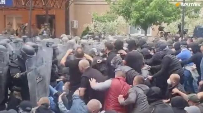 視頻記錄顯示,在當地政府大樓前,科索沃警察和北約部隊的軍人不允許抗議的塞族人靠近。雙方發生推搡,并逐漸升級為肢體沖突。北約部隊和科索沃警方向抗議人群投擲催淚瓦斯和閃光彈,現場頻繁響起槍聲。