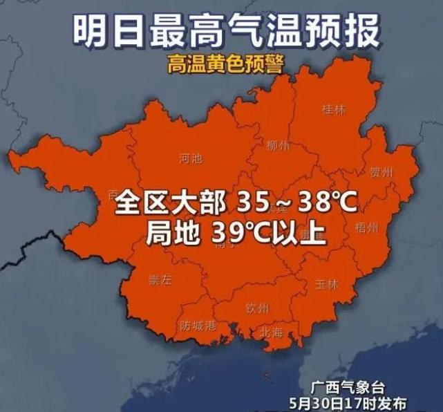 據(jù)預計,31日白天廣西全區(qū)大部分地區(qū)的最高氣溫將達到35~38℃,局部地區(qū)甚至超過39℃。截至5月31日12時16分,廣西已發(fā)布了65個高溫預警信號,高溫范圍覆蓋了全區(qū)各地。不僅僅是氣溫高,濕度也較高。在5月30日下午3時,全區(qū)大部分地區(qū)的相對濕度約為45%,換算成體感溫度可達到45~50℃之間!