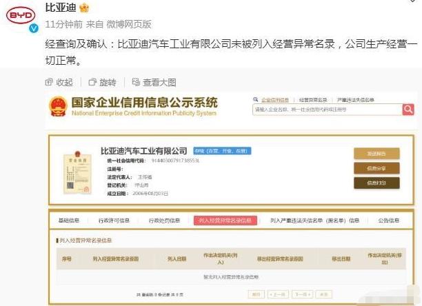 然而,午后,比亞迪官方微博發(fā)表聲明對此進行了回應,稱公司未被列入經(jīng)營異常名錄,公司生產(chǎn)經(jīng)營一切正常。