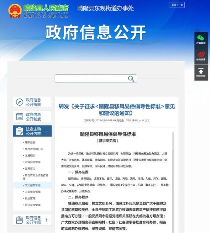 6月2日,紅星新聞記者在晴隆縣政府官網(wǎng)上,已找不到晴隆縣精神文明委員會辦公室5月29日發(fā)布的關(guān)于公開征求《晴隆縣移風(fēng)易俗倡導(dǎo)性標準》意見和建議的通告。但更早之前的5月26日,晴隆縣東觀街道辦轉(zhuǎn)發(fā)了該通告。