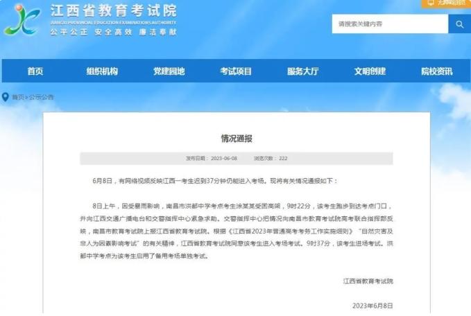 6月8日,一則網(wǎng)絡(luò)視頻反映了江西一名考生遲到37分鐘仍然能夠進(jìn)入考場(chǎng)的情況。針對(duì)此事,江西省教育考試院發(fā)布通報(bào)稱,根據(jù)《江西省2023年普通高考考務(wù)工作實(shí)施細(xì)則》中有關(guān)“自然災(zāi)害及非人為因素影響考試”的規(guī)定,該考生被允許進(jìn)入考場(chǎng)參加考試。考生于9時(shí)37分進(jìn)場(chǎng)考試,考點(diǎn)為其啟用了備用考場(chǎng)進(jìn)行單獨(dú)考試。
