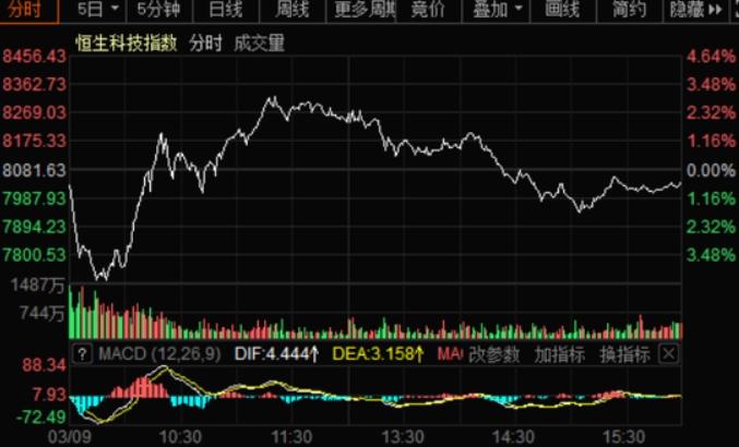 在大型科技股中,阿里巴巴-SW上漲0.72%,騰訊控股上漲1.19%,京東集團-SW持平,小米集團-W下跌0.18%,網易-S持平,美團-W上漲1.18%,快手-W上漲0.94%,嗶哩嗶哩-W下跌1.08%。