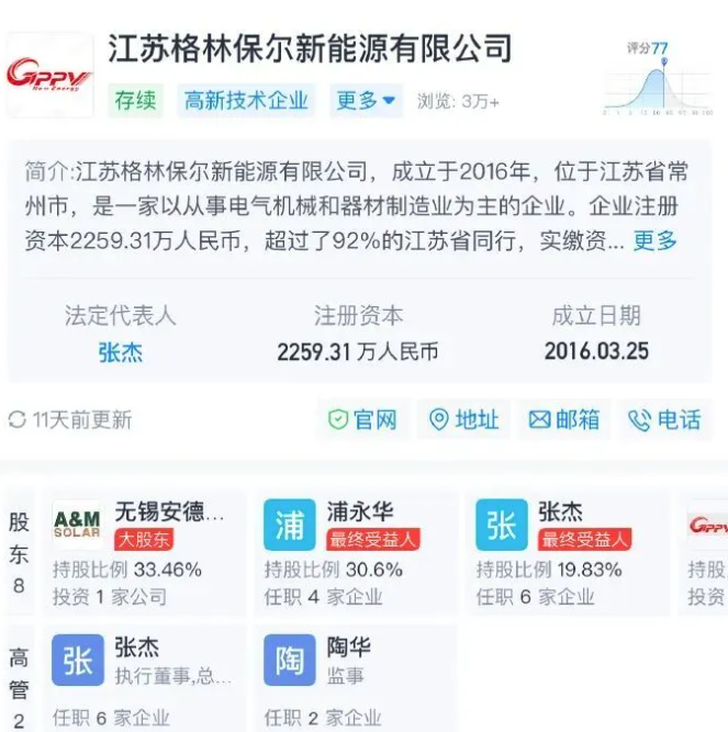 根據天眼查的數據顯示,浦永華持有江蘇格林保爾新能源有限公司30.60%的股份,是該公司的第二大股東。