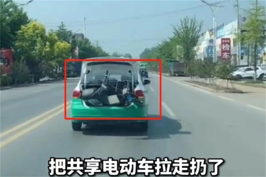 視頻顯示多輛出租車停在路邊,后備箱中裝載著共享電動車。另一段視頻中,這些出租車排成一列在路上行駛。視頻拍攝者在視頻中表示:“這些出租車把共享電動車拉走扔了。”