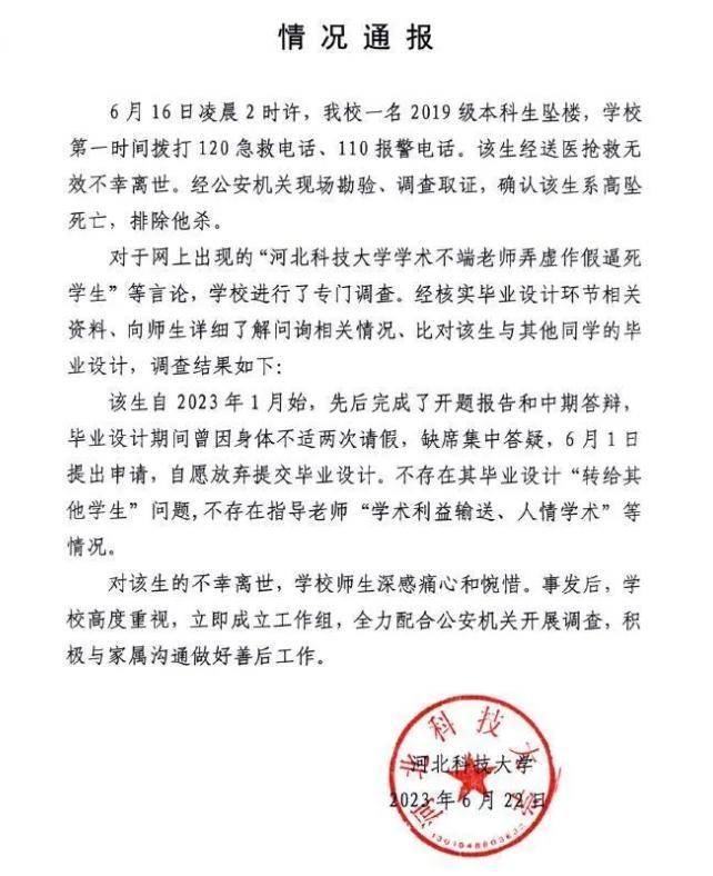 6月16日凌晨2時許,河北科技大學一名2019級本科生發生墜樓事件,學校第一時間撥打了120急救電話和110報警電話。經過送醫搶救,不幸該生無法挽回生命。經公安機關進行現場勘驗和調查取證,確認該生系高墜死亡,并排除他殺可能。