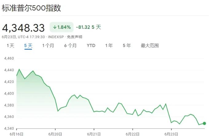一項衡量投資者股票敞口的指標躍升至2022年4月以來最高水平之際,對美聯儲加息的擔憂以及衰退恐慌結束了標普500指數自2021年以來最長連漲勢頭,本周四個交易日(周一美股因六月節假日休市)下跌1.4%。另外,納斯達克100指數跌1.3%。