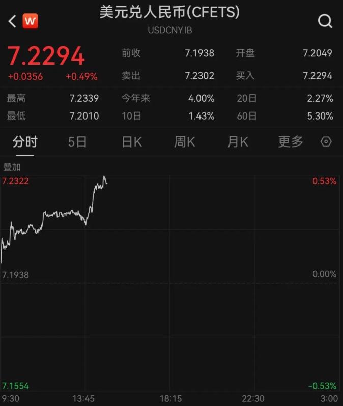 當天,人民幣兌美元即期匯率開盤即跌破了7.20關口,并進一步走低,連續跌破了7.21、7.22和7.23三個關鍵水平,一度下跌超過350個基點。