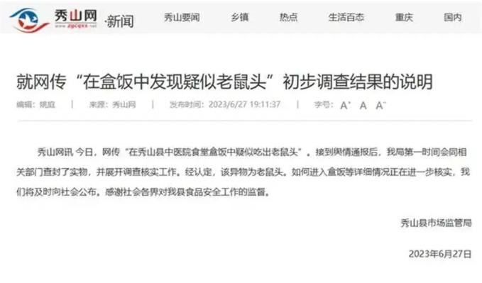 據6月27日秀山縣市場監管局通報,近日有網傳消息稱秀山縣中醫院食堂的盒飯中出現疑似老鼠頭的異物。我局第一時間與相關部門合作,對該異物進行封存,并展開了調查核實工作。經過認定,確認該異物為老鼠頭。針對老鼠頭是如何進入盒飯的詳細情況,我們正在進行進一步的核實,并承諾將及時向社會公布調查結果。感謝社會各界對我們縣食品安全工作的監督。