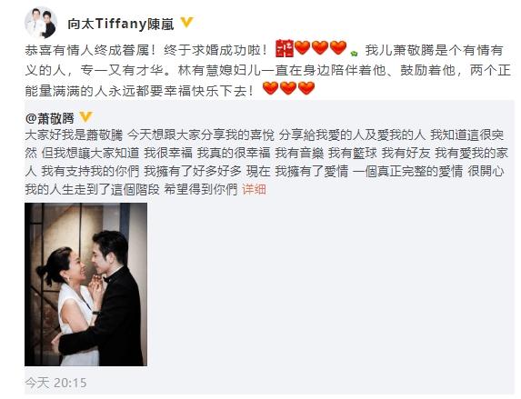 6月27日,蕭敬騰在社交媒體上宣布求婚成功的消息,迅速引起了粉絲們的關(guān)注和祝福。在這個(gè)特殊的時(shí)刻,蕭敬騰的婆婆向太也發(fā)表了自己的祝福。她轉(zhuǎn)發(fā)了蕭敬騰的官方宣布,并表示祝賀這對(duì)有情人終成眷屬。向太充滿喜悅地稱贊她的干兒子蕭敬騰是一個(gè)有情有義的人,不僅專一而且才華橫溢。對(duì)于林有慧,向太親切地稱她為兒媳婦兒,并強(qiáng)調(diào)她一直在蕭敬騰身邊支持和鼓勵(lì)著他。她希望這對(duì)充滿正能量的夫妻能夠永遠(yuǎn)幸福快樂(lè)。