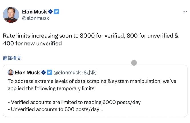 馬斯克在一條推文中詳細介紹了修改后的使用配額。經過驗證的賬戶每天最多可以瀏覽6000條推文,而未經驗證的賬戶則最多瀏覽600條推文。新注冊的未經驗證的賬戶面臨更嚴格的限制,每天最多發300條推文。馬斯克隨后又發布一條推文,宣布已驗證的賬戶瀏覽推文數量的限制將增加到8000條,未驗證的賬戶將增加到800條,而新注冊的未驗證用戶將增加到400條。