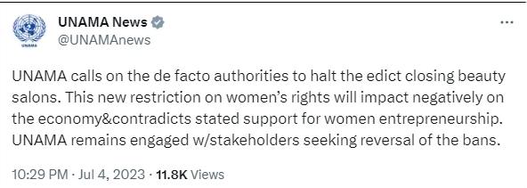 聯合國阿富汗援助團在推特上呼吁塔利班撤回這一禁令,指出它將對經濟產生負面影響,并與支持女性創業相矛盾。該團體正與相關方溝通,尋求撤銷這一禁令。