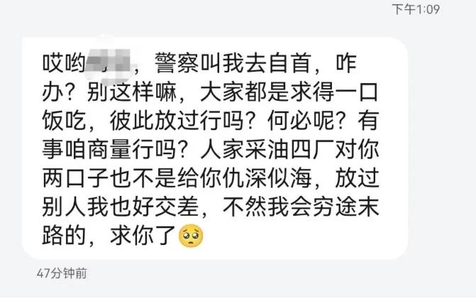 楊先生報警后,警方確定對方使用的號碼未進行實名登記。盡管警方鎖定了號碼使用的范圍,但無法確定手機使用者的身份。采油四廠的前同事告訴楊先生要小心,稱單位準備起訴他。楊先生認為自己只是如實陳述了家屬的情況和訴求,不應該受到起訴,因此又發布了相關情況的文章。