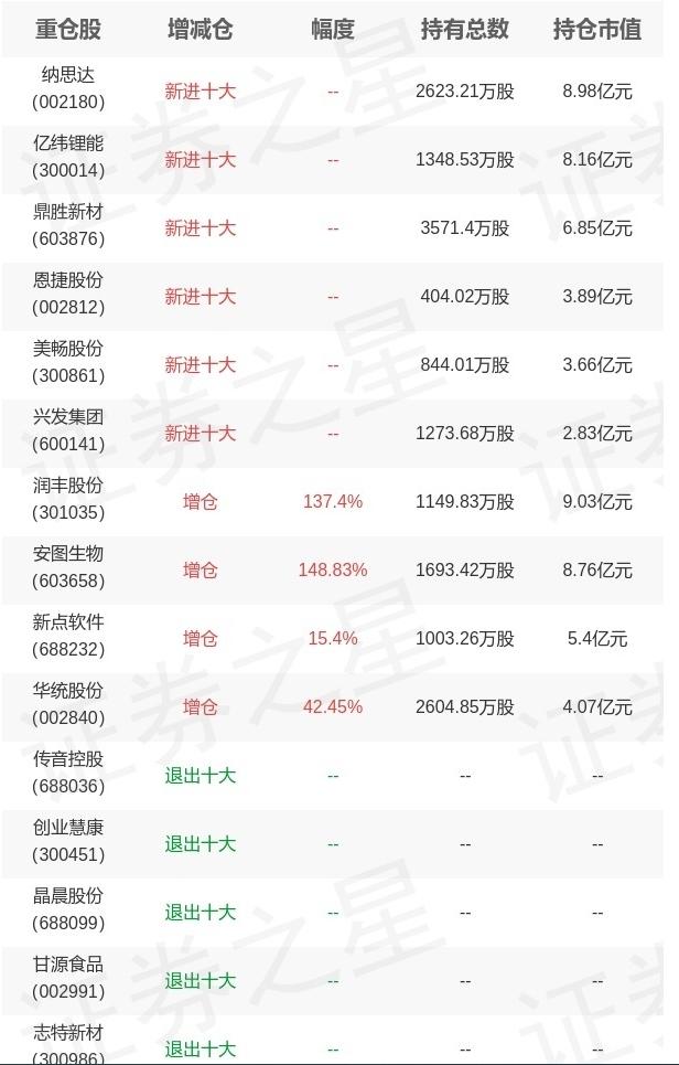 新增重倉股:納思達、億維鋰能、鼎勝新材、恩捷股份、美暢股份、興發(fā)集團。
