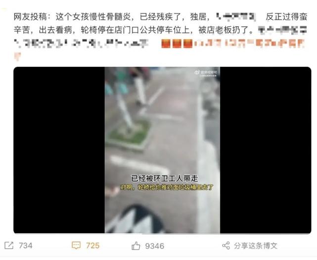 視頻顯示,女生將輪椅放置在路邊的公共區(qū)域,然而輪椅卻被一家店鋪的人員推到垃圾堆里,最后被環(huán)衛(wèi)工撿走。此舉引發(fā)了雙方的爭執(zhí)。店家表示:“輪椅放在人家店門口,不覺得不妥嗎?你能怎么樣,我推了,我也承認(rèn)了。”