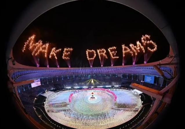 成都成就夢想。隨著大運(yùn)會火炬塔被點燃,焰火在空中打出成都大運(yùn)會的U形會徽,體育場上空焰火呈現(xiàn)英文字樣“Make Dreams Come True”。