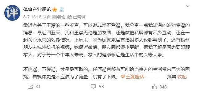 他進一步表示:“我分享一點我知道的絕對靠譜的消息:最近四五天,我和王濛無論是朋友圈,還是微信私聊都有不少互動,還在一起關心水災的救援情況。上周末,她直播很多人也都看到了,還有粉絲朋友去杭州接機的視頻。她最近微博、朋友圈都很少更新,據我了解是因為要照顧家人。對于每一個中年人來說,家人的健康永遠是生活中的頭等大事。”