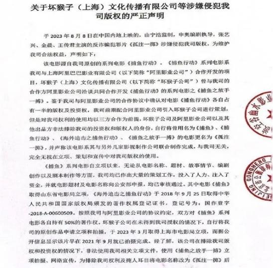 在充滿了創意和激情的電影創作領域,版權保護問題愈發顯得重要。8月17日,寧波空谷幽水影業公司在其微博上發布了一份聲明,聲稱電影《孤注一擲》存在侵犯其自家原創系列電影《捕魚行動》的版權問題,已向國家電影局舉報并提起訴訟。這一事件引發了業內外廣泛關注。
