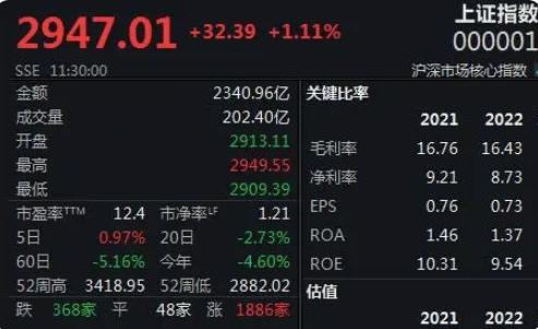 今日A股市場迎來了一輪放量大漲,隨著近4500股上漲,市場情緒回暖,令人振奮。上證指數漲1.11%,報2947.01點,深證成指漲2.34%,報9406.42點,而創業板指更是漲幅高達3.34%,報1870.22點。這股市場漲勢的背后有著多重因素的支持。
