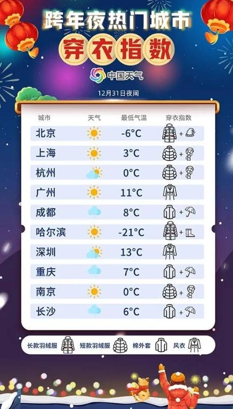 為了讓您在假期出行更加舒適,中國天氣網為您提供了跨年夜穿衣指數,讓您在寒冷的氣候中依然能夠保持溫暖。