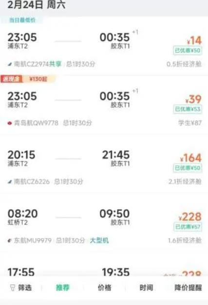 更為驚喜的是,本周上海飛往重慶的機票最低票價僅為31元,飛往青島的機票更是低至14元,一些特價機票一上線便迅速售罄,可見旅客們對于價格實惠的機票的強烈需求。