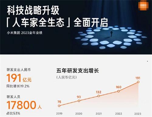 與此同時(shí),小米集團(tuán)發(fā)布了2023年財(cái)報(bào),數(shù)據(jù)顯示,小米集團(tuán)在過去一年實(shí)現(xiàn)了總收入2710億元,經(jīng)調(diào)整凈利潤(rùn)193億元,同比增長(zhǎng)了126.3%。更令人振奮的是,“人車家全生態(tài)”戰(zhàn)略全年研發(fā)投入191億元,增長(zhǎng)了19.2%,研發(fā)人員總數(shù)達(dá)到了17800人,占比達(dá)到了53%。其中,智能電動(dòng)汽車等創(chuàng)新業(yè)務(wù)更是投入了67億元。