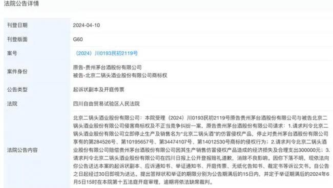 根據天眼查顯示的信息,四川自由貿易試驗區人民法院已向北京二鍋頭酒業股份有限公司送達了貴州茅臺酒股份有限公司與其之間商標權侵權及不正當競爭糾紛案的起訴狀副本及開庭傳票。