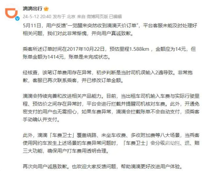 面對網友的質疑和聲討,滴滴出行官方賬號回應稱已有專員核實處理,并承諾盡快聯系小關解決問題。隨后,平臺客服通過電話聯系小關,表示將把訂單金額修改為14元。然而,對于費用異常的原因,平臺方并未給出明確解釋,僅稱可能是司機誤操作。