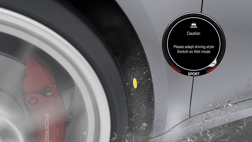 濕模式主要用于降低在潮濕路面上滑水的風險,系統有兩個部分:檢測和反應。保時捷稱Wet模式使用前輪罩后面的聲學傳感器來有效地聆聽噴霧量,如果超過一定閾值,汽車將建議打開濕潤模式。