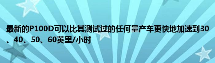 在最近更新之后,特斯拉Model S P100D再次重設了記錄簿,設置了令人驚嘆的0-60mph時速,僅為2.2755秒。時間由Motor Trend使用其推出時間格式來確定。但是,即使此格式減去了行程的第一英尺,2.28秒的時間也令人難以置信。根據該出版物,最新的P100D可以比其測試過的任何量產車更快地加速到30、40、50、60英里/小時。