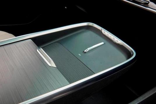 中央扶手臺處有兩塊無線充電面板,上層則有可伸縮的實(shí)木蓋板來保護(hù)該面板。