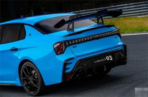 車身側面,車身造型低趴,內凹的車內襯托的車身的肌肉感十足,充滿力量感。后視鏡、輪轂以及側裙處皆采用熏黑處理。車尾方面,則參考了曾打破紐北賽道最快四門轎車和最快前驅車兩項紀錄的03 Concept Car的設計造型,采用“鵝頸式尾翼“造型,兼顧了空氣動力學和美感的需要,“斜邊四出排氣“預示著該車將會擁有賽車級的出色性能。