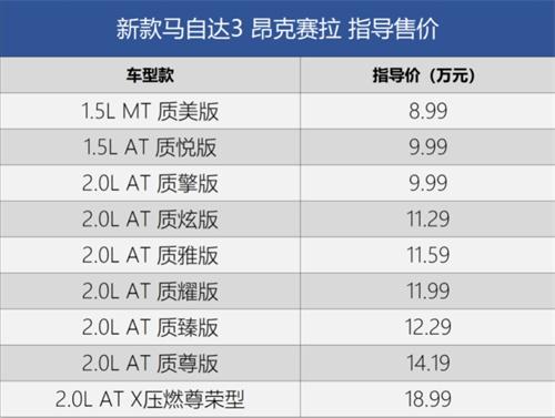長安馬自達宣布旗下的新款馬自達3 昂克賽拉正式上市,共推出9款車型,售價區間為8.99-18.99萬元。作為年度改款車型,新車進行了大幅的價格下調,同時對配置進行了精簡調整,為消費者提供更具競爭力的選擇。其中,新增的2.0L AT 質臻版車型取代了此前的質睿版,配置上也進行了一些優化。