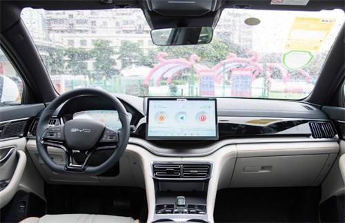 進入車內,全新海豹SUV采用了雙色拼接造型,營造出個性化氛圍。中控臺寬厚的設計內嵌大尺寸液晶儀表和懸浮式中控大屏,增加了科技感。寬厚的熏黑烤漆飾板連接空調出風口,進一步增加了視覺寬度。檔位區域設計低矮的電子檔把,結合物理按鍵,操作手感出眾。