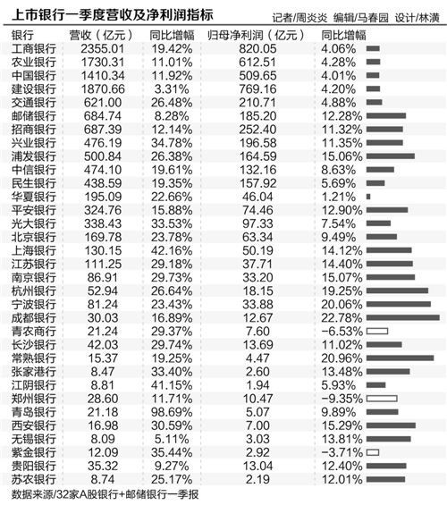 21世紀經濟報道記者梳理了33家上市銀行一季報發現,眾多銀行一季度營收大幅攀升,不僅以青島銀行為代表的城農商行同比增99%,甚至國有大行都重新邁入了兩位數增長行列;但相比之下,利潤多數仍維持個位數增長。