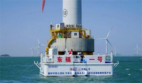 本次設(shè)備實(shí)驗(yàn)經(jīng)過多家能源企業(yè)的支持,據(jù)了解,這一次的海上中試是在五月份中旬和下旬于福建興化灣海上風(fēng)電場正式開展的,由上述研究團(tuán)隊(duì)聯(lián)合研制了全球首套可再生能源相結(jié)合的漂浮式海上制氫平臺(tái),被命名為東福一號(hào),這個(gè)平臺(tái)是一臺(tái)樣機(jī),它的功能相當(dāng)于一臺(tái)大型的海上風(fēng)電機(jī)組結(jié)合而成的一體化海水制氫設(shè)備。