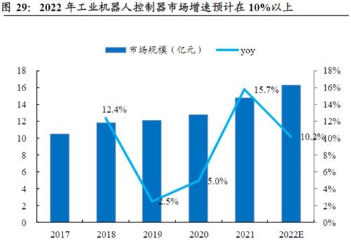 我國工業(yè)機(jī)器人控制器軟硬件的開發(fā)實(shí)力在如今已經(jīng)得到了不斷增強(qiáng)的推動效果,需求量也日益提升,下游市場呈現(xiàn)飛速增長的趨勢,國內(nèi)工業(yè)機(jī)器人的控制器市場規(guī)模。從2017年的10.5億元已經(jīng)上升到2021年的14.7億元,預(yù)計(jì)在2022年,國內(nèi)工業(yè)機(jī)器人控制器市場規(guī)模將會突破到16.2億元。