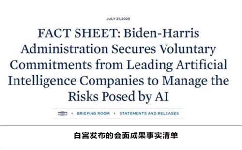 7月21日,美國白宮宣布,七大AI企業已經與拜登政府簽署了協議,承諾愿意采取監督措施管理AI技術開發的風險,為AI生成內容添加數字水印,這七大巨頭的高管在當天與總統拜登會面。在此之前,大多數公司發表的聲明均是愿意與白宮方面合作,并且強調會自愿設置護欄,拜登表示,AI對社會經濟以及國家安全是有著巨大的風險,雖然能帶來難以置信的機遇,但是風險也是不得不把控的。