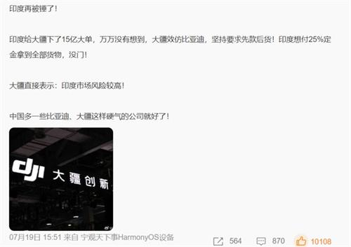 近日,大疆與印度的全款訂單引發了行業內的廣泛關注。根據網上流傳出來的外媒報道信息來看,自從比亞迪之后,印度就給大疆公司下達了15億盧比的大單,不過大疆公司堅持要求先全款支付后發貨,大疆給出的理由是印度市場風險較高。從目前的情況來看,該消息是否屬實還是有一定的不確定性,大疆公司并沒有公開表態。