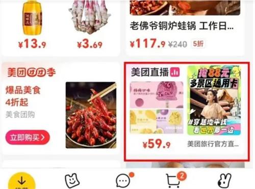 七月初,美團首頁正式推出了直播固定板塊,宣告正式攻入抖音的腹地領域,打響了屬于自己的自衛反擊戰。在美團直播固定入口測試階段,部分受到邀請的用戶可以通過點擊美團APP的信息流欄目板塊進入到直播詳情頁面。從而可以觀看這些直播進行消費,如今的美團直播主要是以平臺直播為主,商家直播的占比率較少。