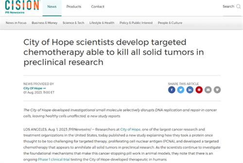8月2日消息,美國頂級癌癥治療和研究機構希望城市國家醫療中心在周二的時候發布信息稱,基于臨床前研究,該機構科學家已經開發出一種能夠殺死所有實體惡性腫瘤的靶向化學藥物。在這一份公告中表示,這種藥物是一款可以遏制腫瘤細胞增殖的口服小分子增殖細胞核抗原抑制劑,目前這篇論文已經發布在《細胞化學生物學》期刊中。