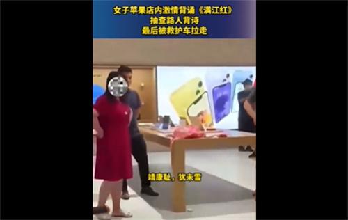 8月10日上午,網上流傳一段紅衣大媽大鬧蘋果手機門店的視頻。據視頻中所述,這起事件是發(fā)生在北京太古里的一家蘋果店,紅衣大媽一邊在店鋪里怒砸iPhone手機,一邊叉著腰大罵使用iPhone手機的中國人都是每日走狗,是漢奸。這位大媽在蘋果店里慷慨激昂的吟誦《滿江紅》,甚至還抽查路邊的行人背詩,讓人感到幽默的事情是,這位紅衣大媽最后被救護車拉走的時候還撂下一句臺詞,她說:“等著吧,我還會出來的”。