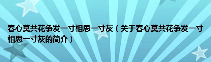 大家好,春心莫共花爭發(fā)一寸相思一寸灰,關于春心莫共花爭發(fā)一寸相思一寸灰的簡介很多人還不知道,現在讓我們一起來看看吧!