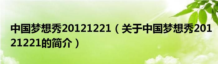 大家好,中國夢想秀20121221,關于中國夢想秀20121221的簡介很多人還不知道,現在讓我們一起來看看吧!