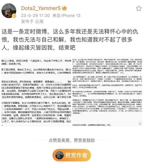 5月29日下午,國內(nèi)在Dota2賽事知名的游戲電競(jìng)解說Yammers定時(shí)微博引起了轟動(dòng),微博內(nèi)容表示童年的霸凌以及原生家庭給他自身疊加帶來了大量心理的創(chuàng)傷,這一則微博更類似于遺書,而根據(jù)后續(xù)消息確認(rèn)這位電競(jìng)解說選手已經(jīng)離世。