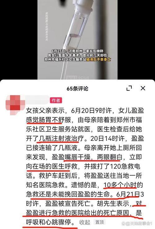 河南高考成績出來了,一位考生成績過了一本線,但是考生卻因為輸液導致死亡。在河南鄭州居住的胡先生電話里說,6月20日清晨自己的侄女小可感覺到腸胃不舒服,表現的主要癥狀是拉肚子,小可母親前往了附近的福樂社區衛生服務站,和王姓醫生描述小可病情,沒有面診的情況下,醫生開設了治療腸胃的注射液,于是小可母親帶回去給女兒輸液,一共三四個小時之間輸了四五瓶液體。