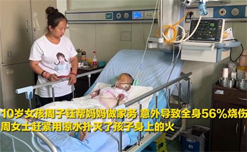 根據周子鈺媽媽的介紹,當時6月23日下午6點多的時候,做飯的時候將小孩子從廚房放到臥室,在廚房時燃氣還沒有關,大的女兒就幫自己去把燃氣關掉,當時大女兒穿的是大荷葉邊袖的棉麻衣,被火點燃之后燃燒極為迅速,就最終造成了重度燒傷。
