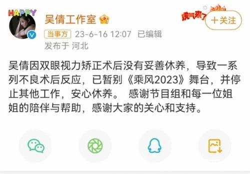 近日吳倩工作室發表文章表示無限因為視力矯正手術所產生的不良反應只能退賽,工作室也分享了關于吳倩出院的記錄,并表示正在休養過程中,ICL是目前比較受歡迎的摘掉眼鏡的一種方式,這一摘掉眼鏡的手術究竟是否安全也引起了熱議。