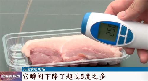 記者利用一盤新鮮的豬肉作為實驗的對象,利用額溫槍將表面溫度測試,溫度為31.20度左右,使用清涼噴霧的過程當中,在豬肉表面能夠看到瞬間結霜,這種情況細節看上去會有很強的降溫效果。在利用額溫槍測試時,豬肉表面的溫度瞬間降低了5度。